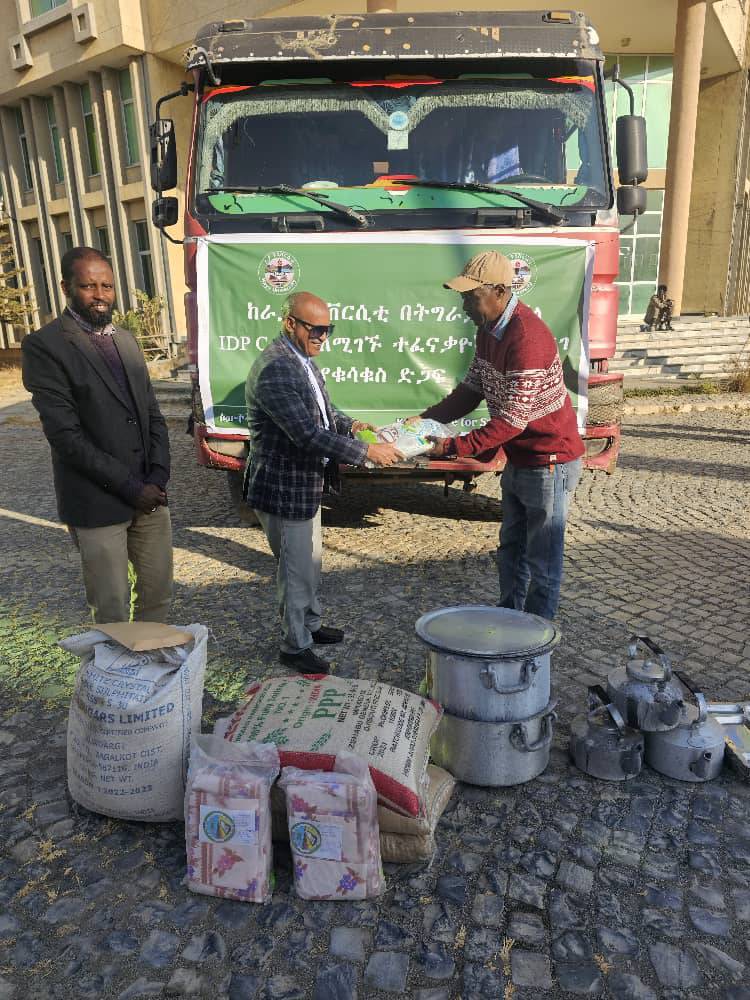 የራያ ዩኒቨርሲቲ ፕረዚደንት ፕሮፌሰር ታደሰ ደጀኔ ድጋፉን ለመቐለ ከተማ አሥተዳደር ከንቲባ የማህበራዊ ጉዳይ አማካሪ አቶ ጌቱ ሃይሉ እና የአፋር ብሄራዊ ክልላዊ መንግስት ላቋቋመው የድጋፍ አሰባሳቢ ግብረሃይል አስረክበዋል፡፡