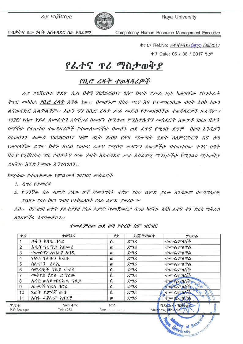 ለቢሮ ረዳት የወጣ የፈተና ጥሪ ማስታወቂያ( Announcement for the Exam Call for Office Assistance )