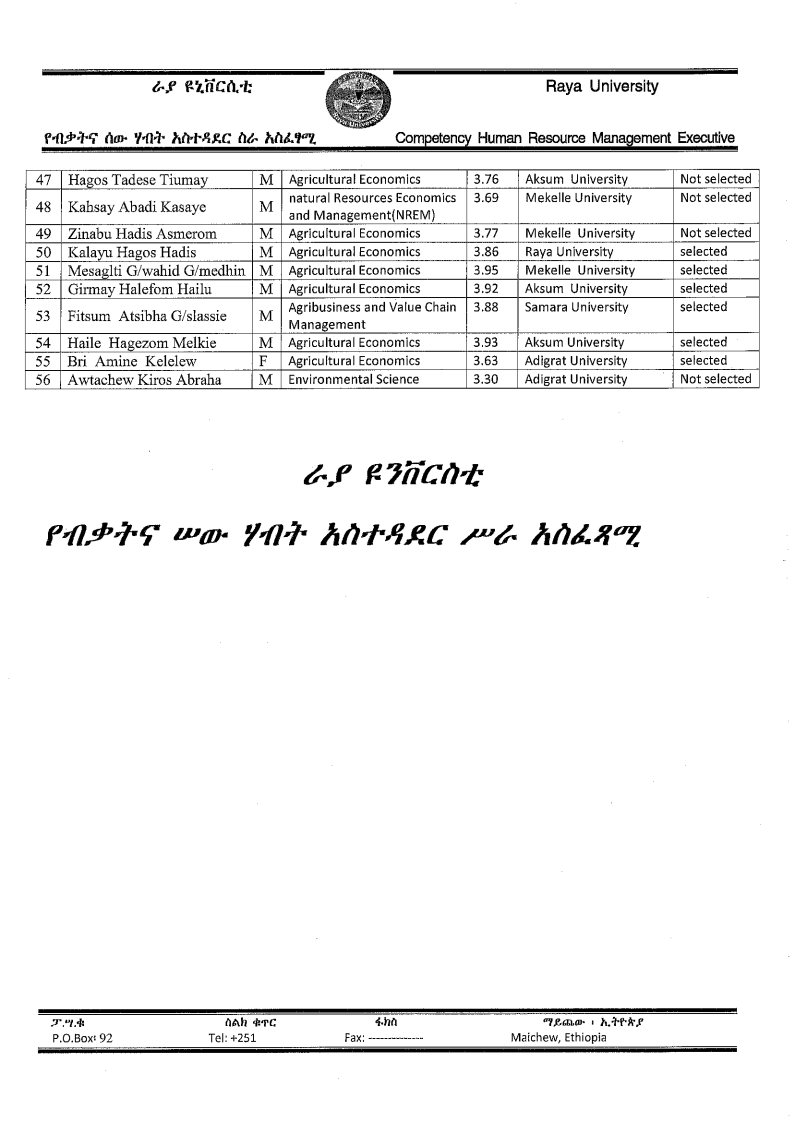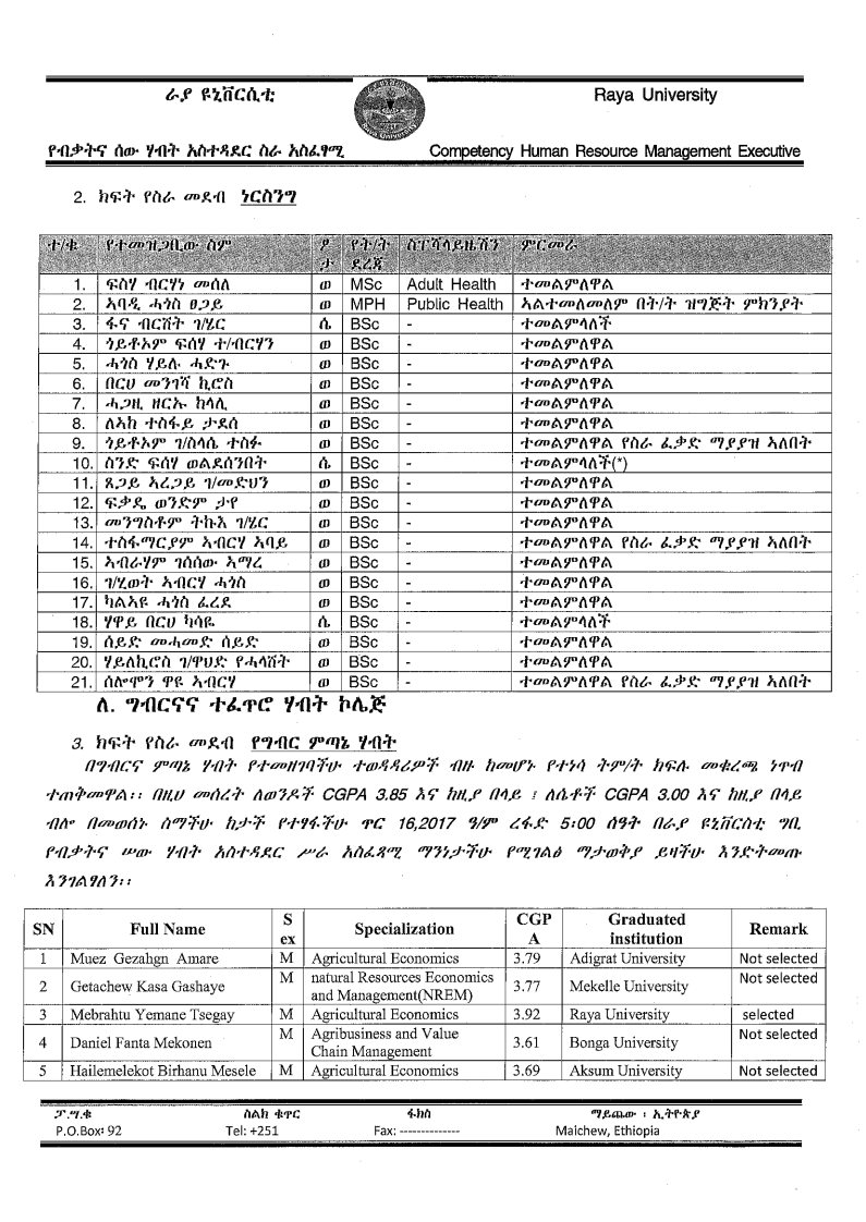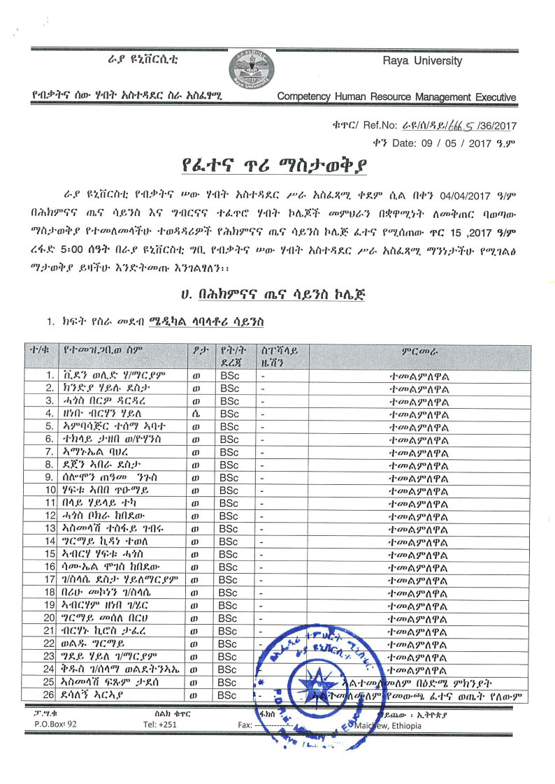 ራያ ዩኒቨርሲቲ መምህራን በቋሚነት አወዳድሮ ለመቅጠር ታኅሣሥ 04 ቀን 2017 ዓ.ም ባወጣው የቅጥር ማስታወቂያ መሰረት በሕክምና እና ጤና ሳይንስ ኮሌጅ ሥር የሜዲካል ላብራቶሪ ሳይንስ (Medical Laboratory Science) እና ነርሲንግ (Nursing) የተመለመላችሁ ፈተና የሚሰጥበት ቀን ጥር 15/ 2017 ዓ.ም ረፋድ 5:00 ሲሆን በግብርና እና ተፈጥሮ ሃብት ሥር የግብርና ምጣኔ ሃብት (Agro-economics) የተመለመላችሁ መምህራን ፈተና የሚሰጥበት ቀን ጥር 16/ 2017 ዓ.ም ረፋድ 5:00 መሆኑን የራያ ዩኒቨርሲቲ የብቃትና ሠው ሃብት አሥተዳደር ሥራ አሥፈፃሚ ጽ/ቤት ያሳውቃል፡፡